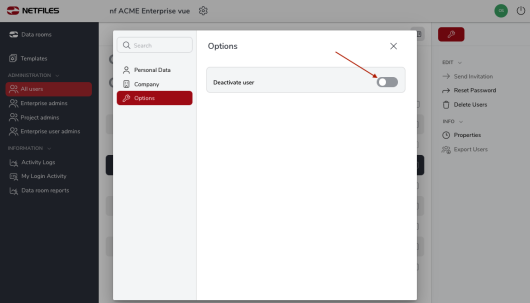 You can also temporarily deactivate a user by clicking on their name and ticking “Deactivate user” under the “Options” tab. Only Enterprise administrators at Enterprise level can do this. While a user is deactivated, they cannot log in. A deactivated user does not consume a user license in the Enterprise environment.