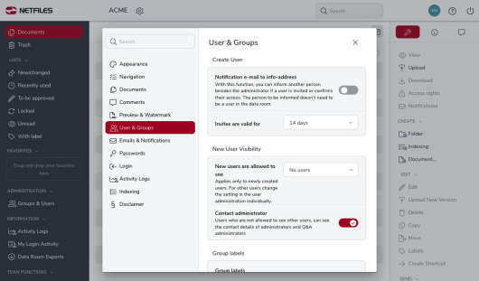 Here you will find the options for creating users and their rights. The options set here apply to all users in the data room.