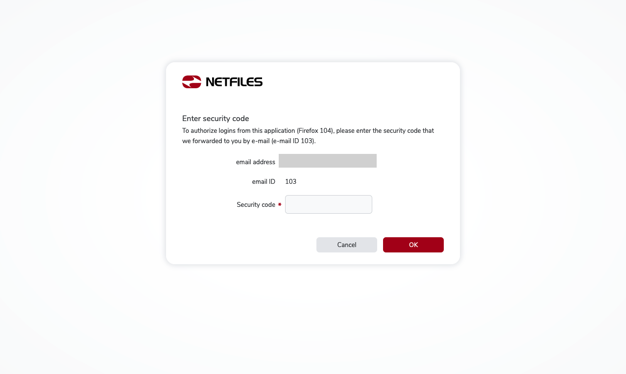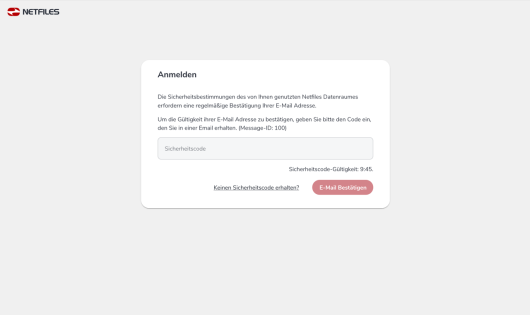 External users are automatically sent a security code by netfiles to the e-mail address stored in their user account the first time they attempt to log in after the set number of days (“verification interval”). After logging in, users see the following window: