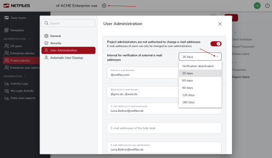 As a netfiles Enterprise Administrator, you can access the “Administration > Settings” and then “User administration” to specify a verification interval for external e-mail addresses.