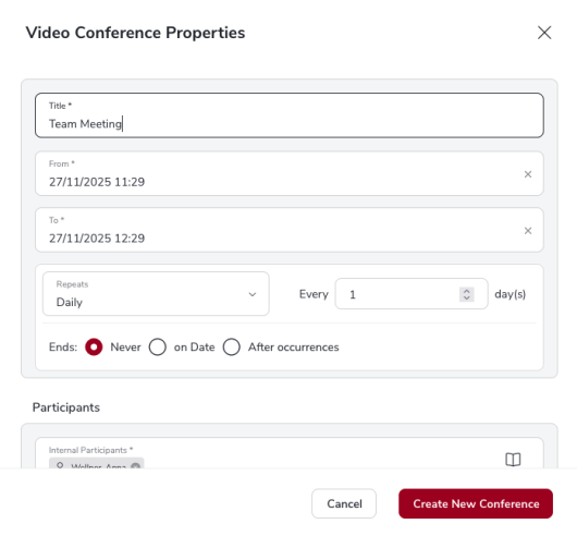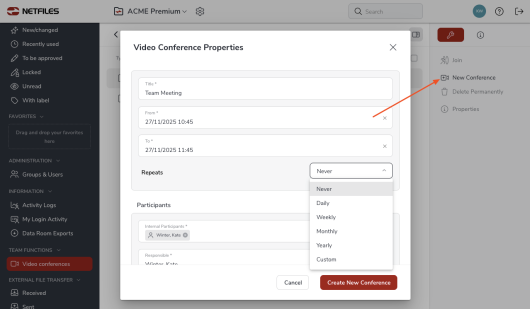 To create a new video conference, select “Video conferences” in the left-hand navigation bar and then click on “New Conference” on the right. In the following dialog , enter the name of the video conference and the planned date and time, and, if desired, a repeat.