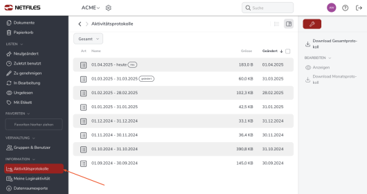 Administratoren eines netfiles Datenraums haben im Bereich „Informationen“ > „Aktivitätsprotokolle“ in der linken Navigationsleiste Zugriff auf das Aktivitätsprotokoll. Dort sehen Sie alle protokollierten Aktionen Ihres gesamten Datenraums.