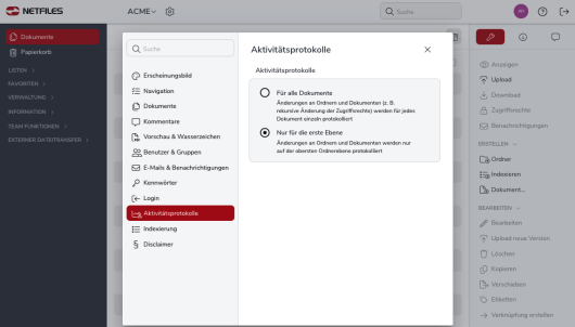 Dort kann festgelegt werden, ob Aktivitätsprotokolle für alle Dokumente protokolliert werden sollen oder dies nur für die erste Ebene gilt. Im einzelnen gilt: