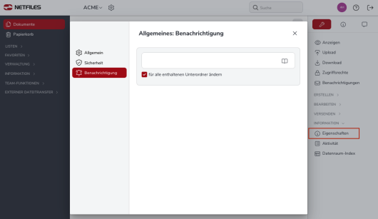 Wählen Sie einen Ordner aus und öffnen Sie “Eigenschaften” in der rechten Funktionsleiste. Öffnen Sie den Reiter “Benachrichtigung” und klicken Sie auf das „Adressbuch”.