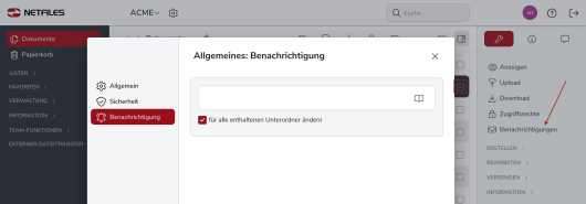 Um die automatische Benachrichtigung (Benachrichtigung bei Änderungen) für einen bestimmten Ordner zu aktivieren, wählen Sie den entsprechenden Ordner aus und klicken anschließend auf die Funktion „Benachrichtigungen“ in der rechten Funktionsleiste.