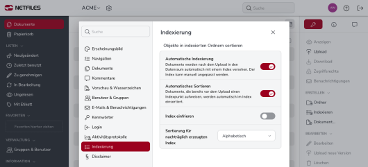 Durch die Aktivierung der “Automatischen Indexierung” werden neue Ordner oder Dokumente, die Sie im Dokumente Bereich anlegen, mit einem Index versehen.