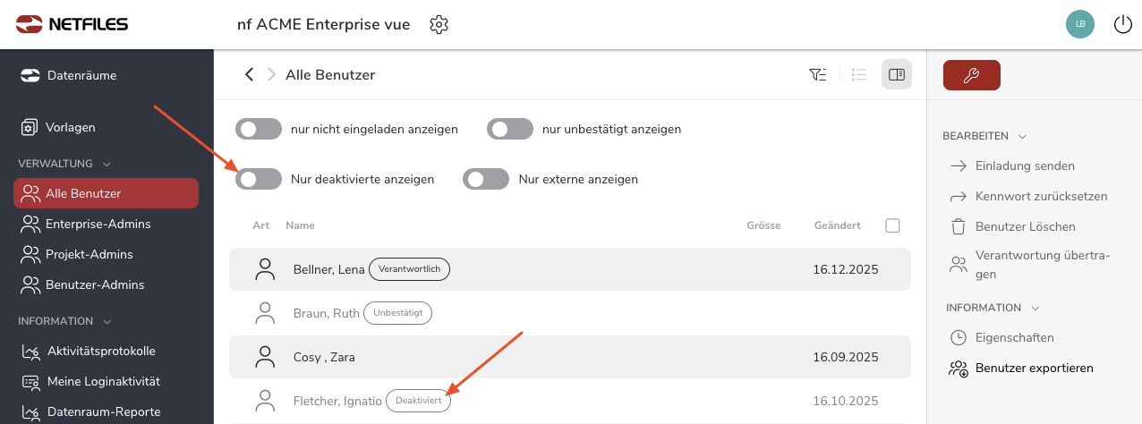 Deaktivierte Benutzer sind mit einem Schild „deaktiviert“ gekennzeichnet. Im Bereich „Alle Benutzer“ können Sie sich durch den Filtern „Nur deaktivierte anzeigen“ ausschließlich deaktivierte Benutzer anzeigen lassen.
