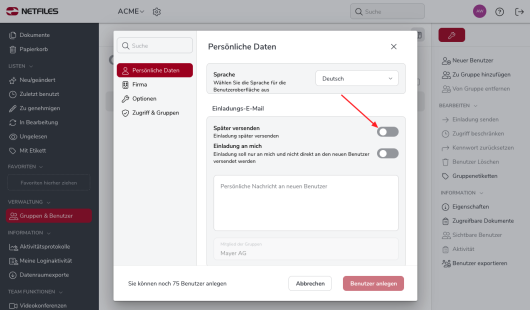 Sie können Benutzer in netfiles optional erst nur anlegen und zu einem späteren Zeitpunkt einladen, z.B. wenn der Datenraum komplett eingerichtet und alle Dokumente eingestellt worden sind.