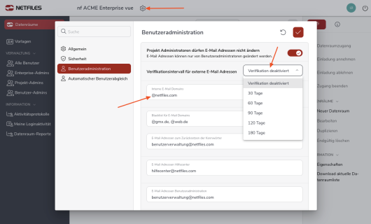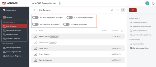 Benutzerverwaltung netfiles Enterprise, Data Room Premium