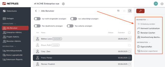 Der Enterprise-Administrator kann Benutzer in einen Datenraum (erneut) einladen. Haken Sie den/die entsprechenden Benutzer an und klicken rechts auf “Einladung versenden”.