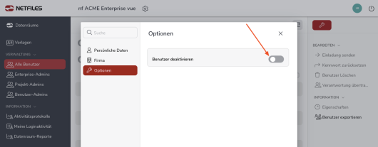 Sie können einen Benutzer auch temporär deaktivieren, indem Sie auf seinen Namen klicken und unter der Registerkarte “Optionen” den Haken setzen bei “Benutzer deaktivieren”. Dies können nur Enterprise-Administratoren auf Enterprise-Ebene. Während ein Benutzer deaktiviert ist, kann er sich nicht einloggen. Ein deaktivierte Benutzer verbraucht keine Benutzerlizenz in der Enterprise Umgebung.