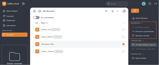 In netfiles Send gibt zwei Benutzergruppen: Administratoren und Benutzer. Im Bereich „Verwaltung“>“Benutzer“ kann man in der rechten Funktionsleiste „neue Benutzer“ hinzufügen.