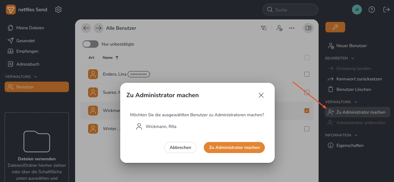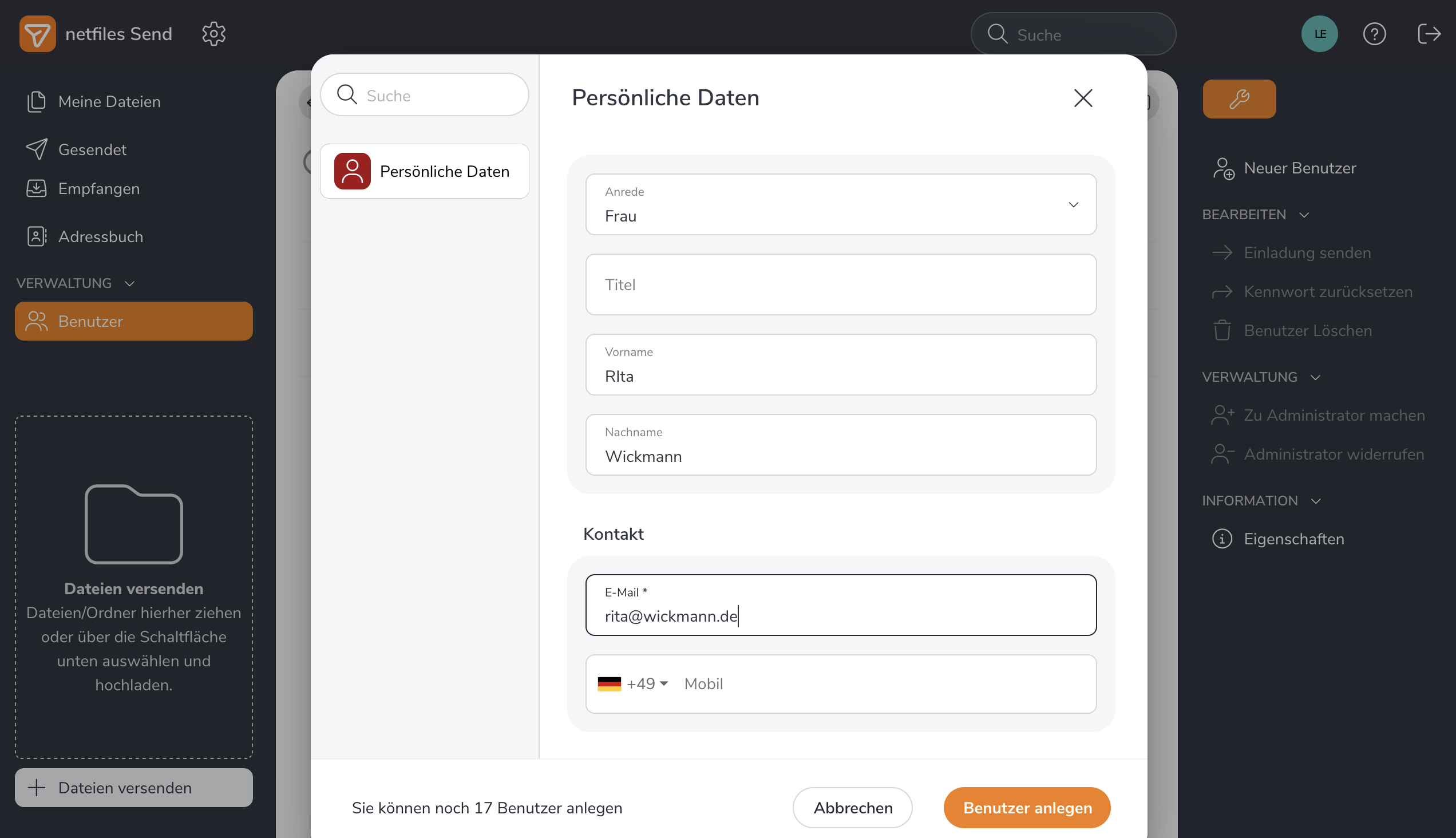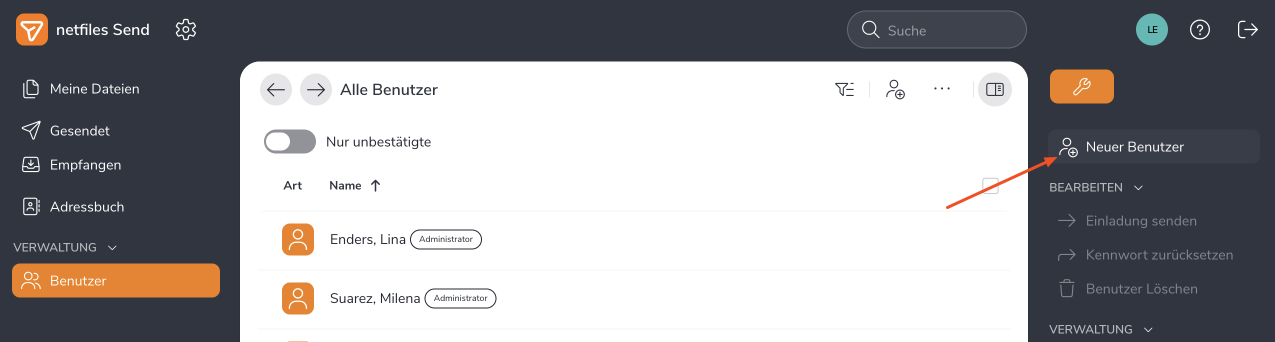 In netfiles Send gibt zwei Benutzergruppen: Administratoren und Benutzer. Im Bereich „Verwaltung“>“Benutzer“ kann man in der rechten Funktionsleiste „neue Benutzer“ hinzufügen.