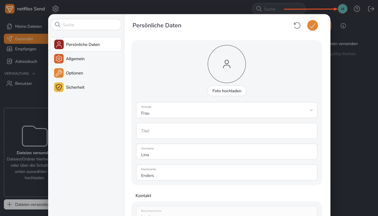 Durch Klick auf Ihren Namen oben rechts gelangen Sie zu Ihren Benutzereinstellungen. Diese sind in persönlichen Daten, Allgemein, Optionen und Sicherheit unterteilt.