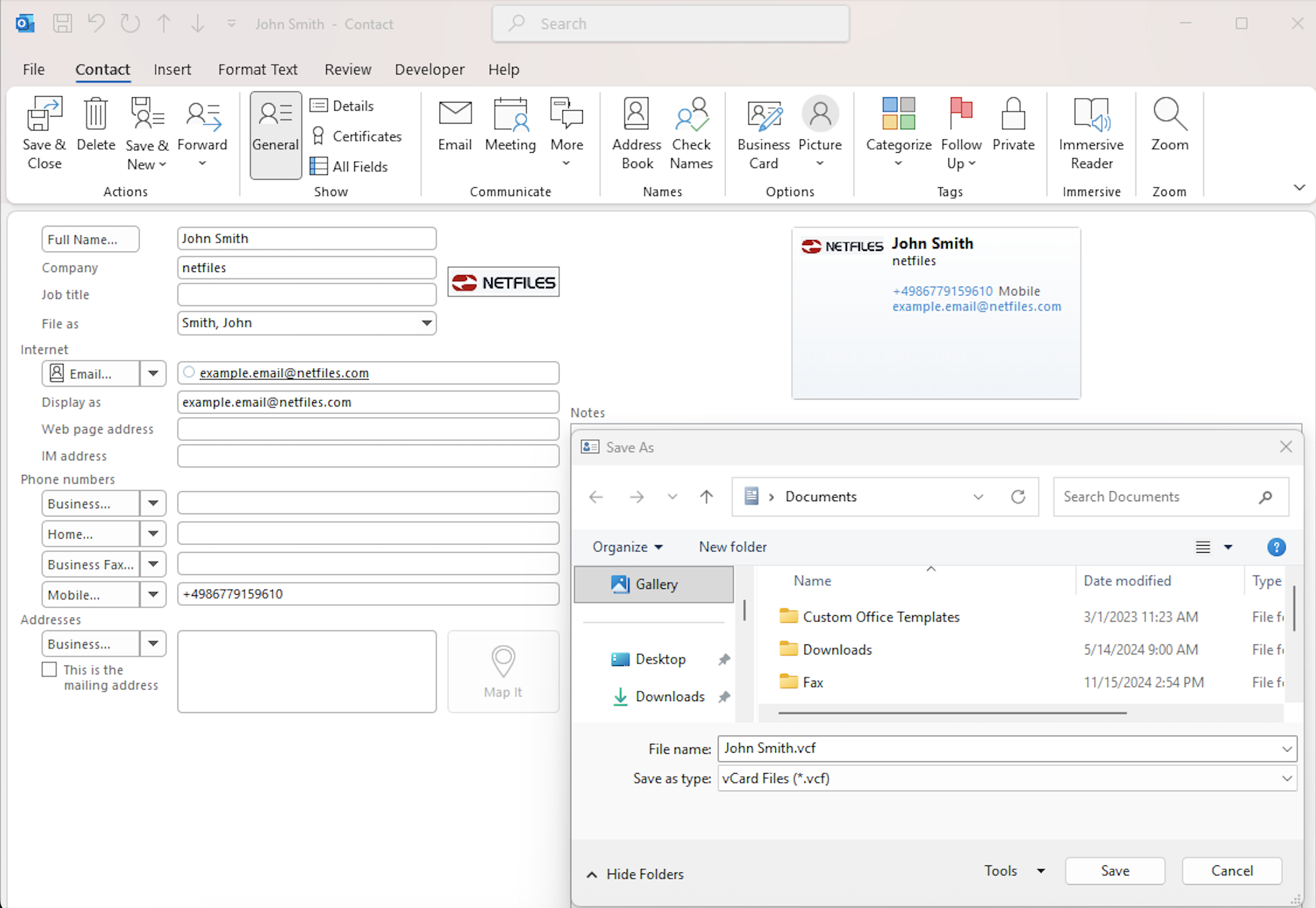 Öffnen Sie in Outlook den gewünschten Kontakt den Sie exportieren möchten. Klicken Sie anschließend „Datei“ > „Speichern unter“. Anschließend wird automatisch .vcf Datei speichern angeboten.