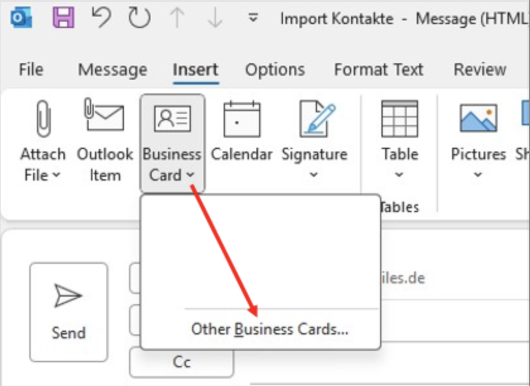 Erstellen Sie eine „neue E-Mail“. Wählen Sie anschließend „Einfügen“> „Visitenkarte“ > „Andere Visitenkarten“. Wählen Sie die entsprechenden Kontakte aus. Diese Kontakte werden der E-Mail hinzugefügt. Nun klicken Sie auf „Anhang“ > „alles auswählen“ > „alles speichern“.
