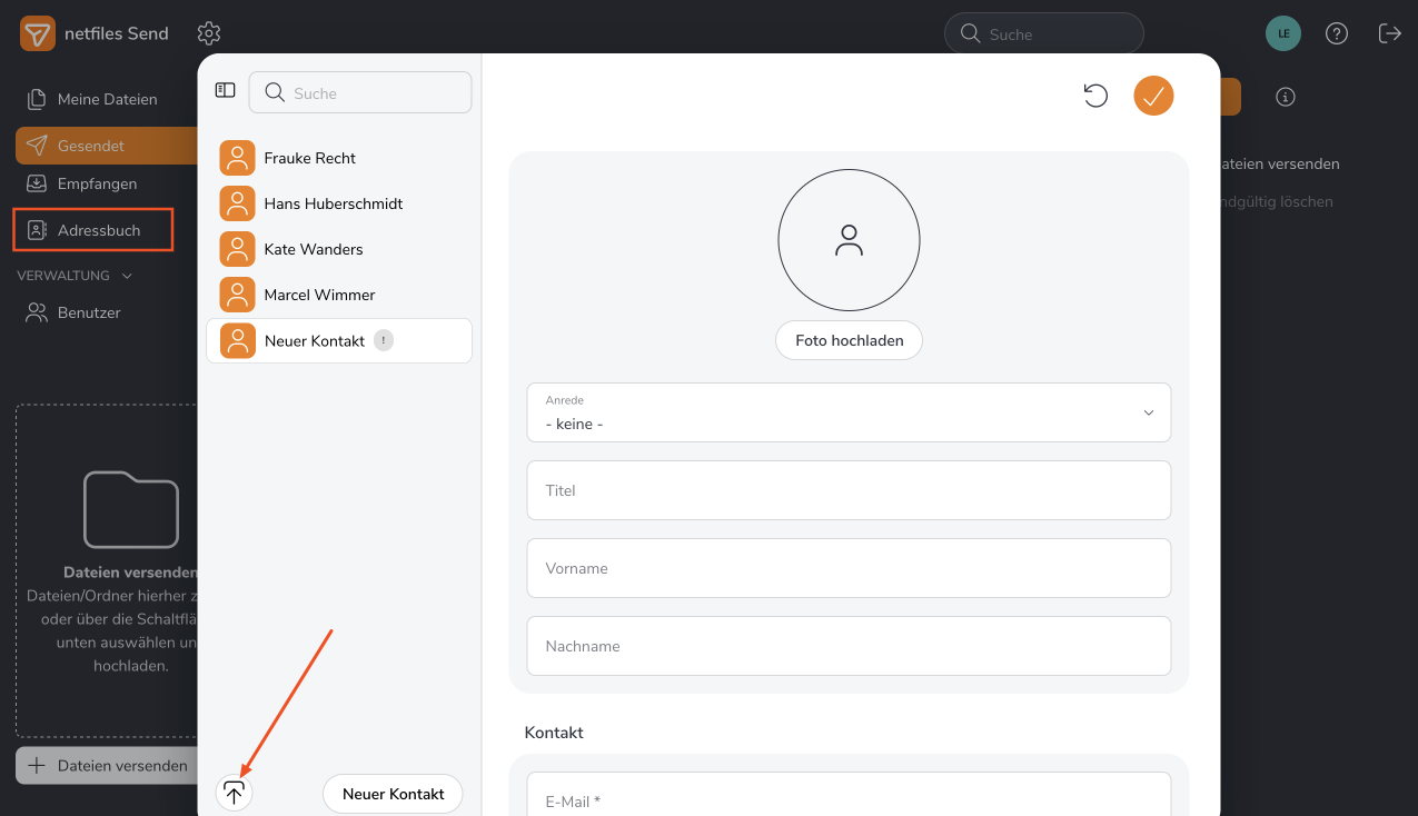 Gehen Sie in netfiles send links auf „Adressbuch“ und klicken Sie auf den Pfeil nach oben „Kontakte laden“. Jetzt wählen Sie die vcf. Datei aus und importieren Sie die Kontakte.