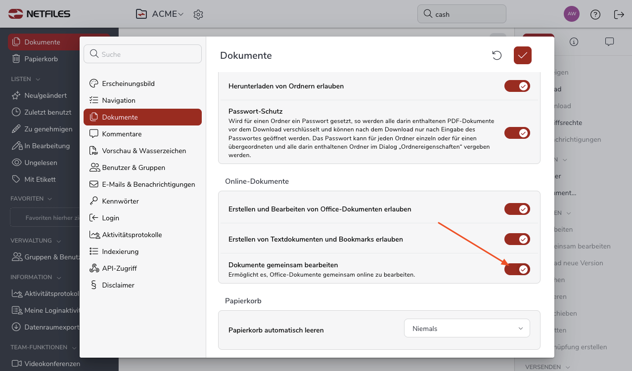 Um dies zu tun gehen Sie (Administrator) in den Datenraum-Einstellungen auf „Dokumente“. Hier finden Sie unter dem Punkt „Online-Dokumente“ die Funktion „Dokumente gemeinsam bearbeiten“. Haken Sie diese an.