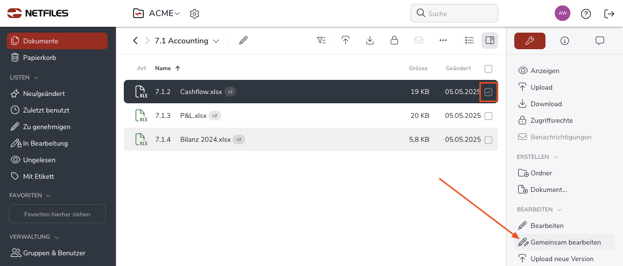 Im Bereich Dokumente haken Sie sich das gewünschte Office-Dokument an und klicken rechst auf „Gemeinsam bearbeiten“.