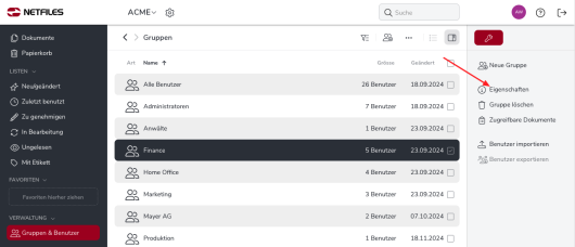 Um einen Gruppenadministrator zu definieren, klicken Sie im Bereich “Gruppen & Benutzer” auf eine Gruppe und wählen Sie in der rechten Funktionsleiste die Funktion “Eigenschaften” .