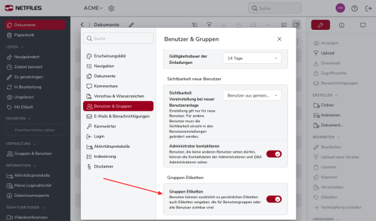 Die Funktion “Gruppenetiketten” muss von einem Administrator des Datenraums in “Verwaltung > Einstellungen > Dokumente” aktiviert werden.