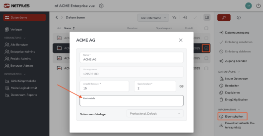 Um eine Kostenstelle in den Datenraum Eigenschaften zu hintelegen wählen Sie den gewünschten Datenraum aus und klicken in der rechten Funktionsleiste auf “Eigenschaften”. Im folgenden Dialog finden Sie weiter unten das Feld “Kostenstelle”.