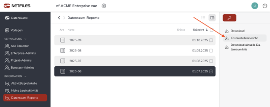 Um einen Kostenstellenbericht zu erzeugen, klicken Sie links unter “Informationen” auf “Datenraum-Reporte” und danach rechts auf “Kostenstellenbericht”.