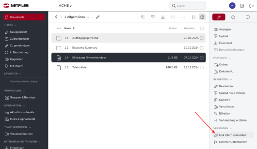 Über “Link intern versenden” können Sie Links auf Ordner und Dateien an andere Benutzer des netfiles Datenraums verschicken. Hierzu markieren Sie die entsprechenden Dateien und Ordner und wählen die Funktion “Link intern versenden” aus der rechten Funktionsleiste.