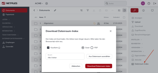 Im netfiles Datenraums können Sie eine Übersicht aller Ordner und Dokumente (Datenraumindex) einsehen und herunterladen.