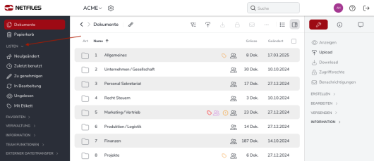 Listen bieten Ihnen einen schnellen Zugriff auf neue bzw. geänderte, zu genehmigende, zuletzt benutzte, abgelaufene, ungelesene oder mit Etiketten gekennzeichnete Dokumente im Datenraum. Bitte beachten Sie, dass in netfiles Data Room Essential und Professional nicht alle Listen verfügbar sind.