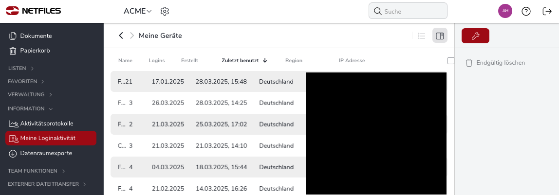 Als Benutzer steht Ihnen in netfiles eine Übersicht über Ihre Login-Aktivität in zur Verfügung. In dieser Liste werden alle Anmeldungen im netfiles Benutzerkonto protokolliert. Wenn Sie sich erstmals mit einer neuen Anwendung (z. B. einem neuen Webbrowser oder über die netfiles App) bei netfiles anmelden, wird diese mit Datum, dem Ort und der IP-Adresse des letzten Logins aufgeführt. Abhängig von Ihrem Internet-Provider kann der Ort des Logins nur ungefähr angegeben werden.