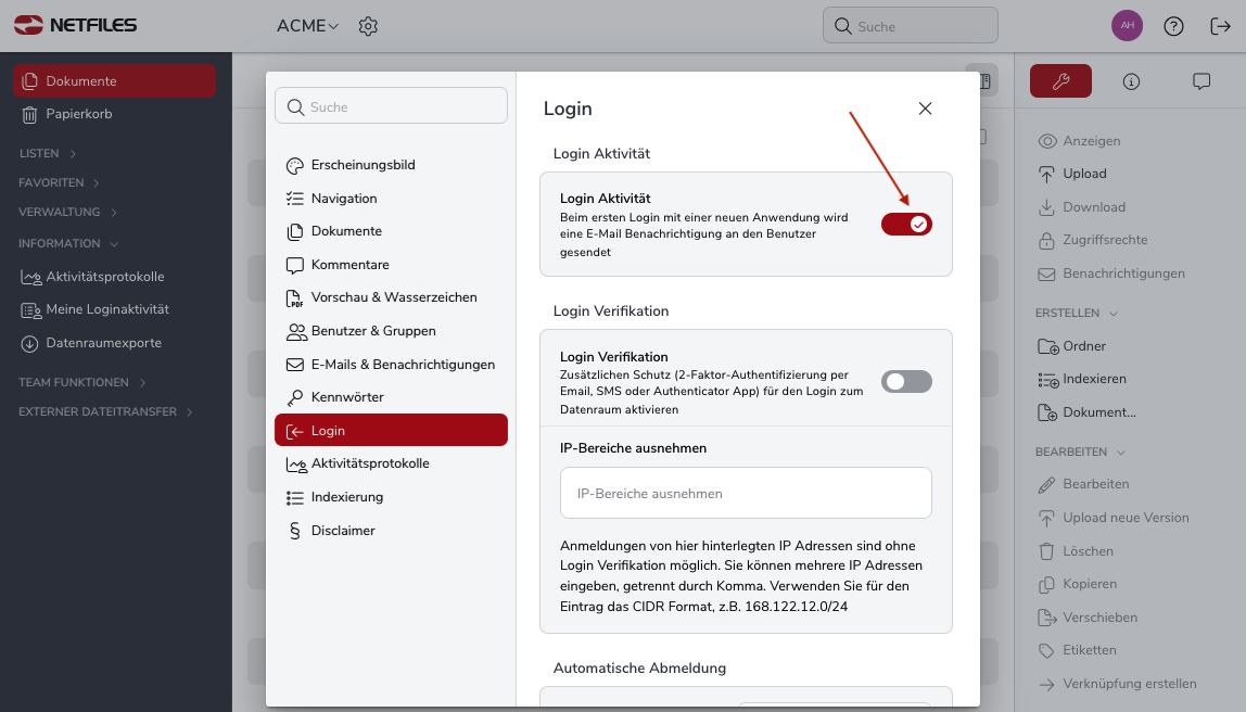 Administratoren können diese E-Mail-Benachrichtigung für Logins mit einer neuen Anwendung in den Datenraum-Einstellungen (durch Klick auf das Zahnrad neben dem Datenraumnamen, im Bereich „Login“) deaktivieren bzw. aktivieren: