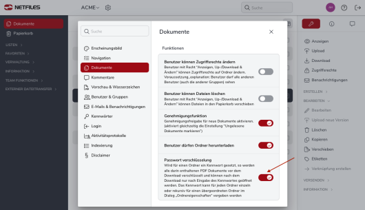 Nachdem das Passwort gesetzt wurde, werden sowohl PDF Dokumente als auch Dokumente die den Benutzern mit der Funktion Download geschütztes PDF bereitgestellt werden mit diesem verschlüsselt. Diese Dateien lassen sich dann nur noch mit diesem Passwort öffnen.
