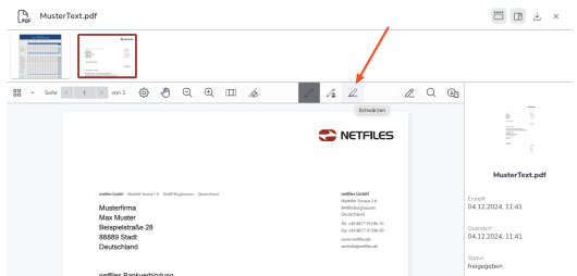 Öffnen Sie unter “Alle Dokumente” das gewünschte PDF-Dokument in der netfiles Dokumentvorschau und klicken Sie oben auf “Schwärzen”.