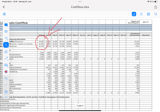 Öffnen Sie das gewünschte Dokumente und tippen Sie oben rechts auf den Stift, um Annotationen im Dokument ein- oder auszublenden. Erst wenn diese Funktion aktiv ist, können Sie über das Stiftsymbol in der darunter angeordneteten Leiste die Annotationswerkzeuge einblenden und verwenden.