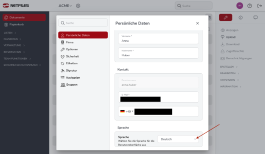 In Ihren “Persönlichen Daten” können Sie die gewünschte Sprache für Ihre netfiles Benutzeroberfläche einstellen. Klicken Sie hierzu auf Ihren Benutzernamen oben rechts und wählen Sie “Optionen”. Dort kann man zwischen Deutsch und Englisch wählen.