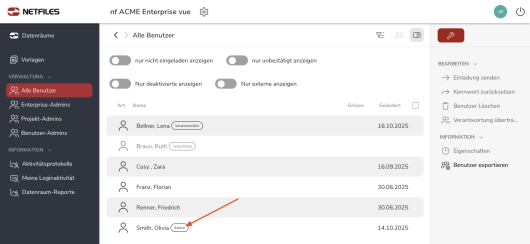 Unter “Verwaltung > Alle Benutzer” werden die entsprechenden Benutzer mit “Verifikation ausstehend” mit „Extern“ markiert. Auch in den Exportlisten „Benutzer“ wird ein entsprechender Hinweis aufgeführt.