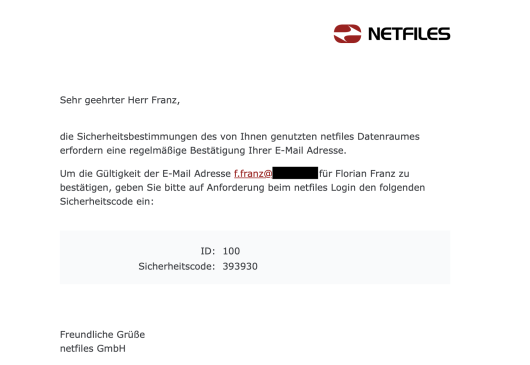 Automatische E-Mail von netfiles mit Sicherheitscode:
