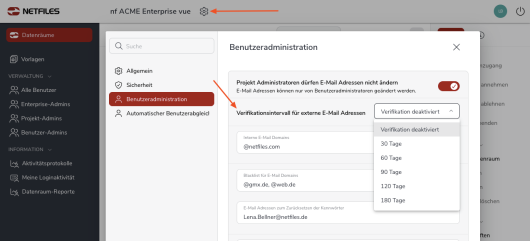 Als netfiles Enterprise Administrator können Sie in den Datenraum Einstellungen und unter “Benutzeradministration” ein Verifikationsintervall für externe E-Mail Adressen vorgeben.