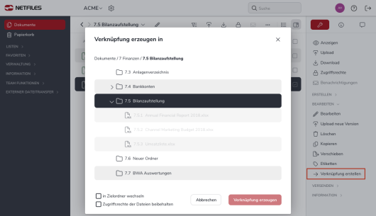 Mit “Verknüpfung erstellen” können Sie eine Verknüpfung (Alias/Link) der ausgewählten Dokumente erzeugen und in einem anderen Ordner innerhalb Ihres Daten- bzw. Projektraumes speichern. Verknüpfungen selbst belegen keinen Speicherplatz.
