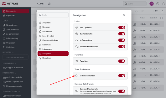 Administratoren können durch klicken des Zahnrads neben Ihrem Datenraumnamen in den Einstellungen unter „Navigation” unter dem Punkt “Team Funktionen” für ihren Datenraum “Videokonferenzen” aktivieren bzw. deaktivieren.