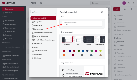 Datenraum Einstellungen- Erscheinungsbild Einstellungen – Logo und Farbe (Admin)