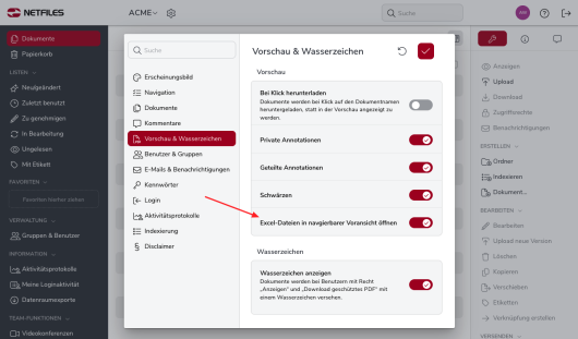 Ein Administrator des Datenraums kann die Funktion unter “Einstellungen > Vorschau & Wasserzeichen > Excel-Dateien in navigierbarer Voransicht öffnen” aktivieren.