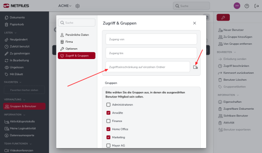 Sie können auch direkt bei der Anlage eines “neuer Benutzer” die Funktion “Zugriff auf Ordner” anwenden. Klicken Sie hierzu im Dialog zur Anlage des neuen Benutzers auf „Zugriff & Gruppen“ und wählen Sie den gewünschten Ordner unter „Zugriff & Gruppen“ aus.